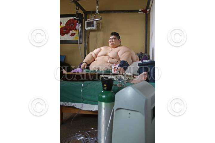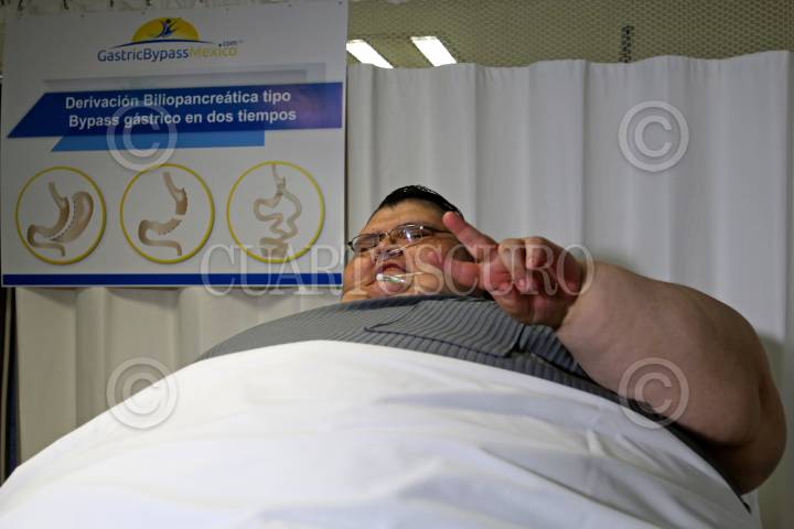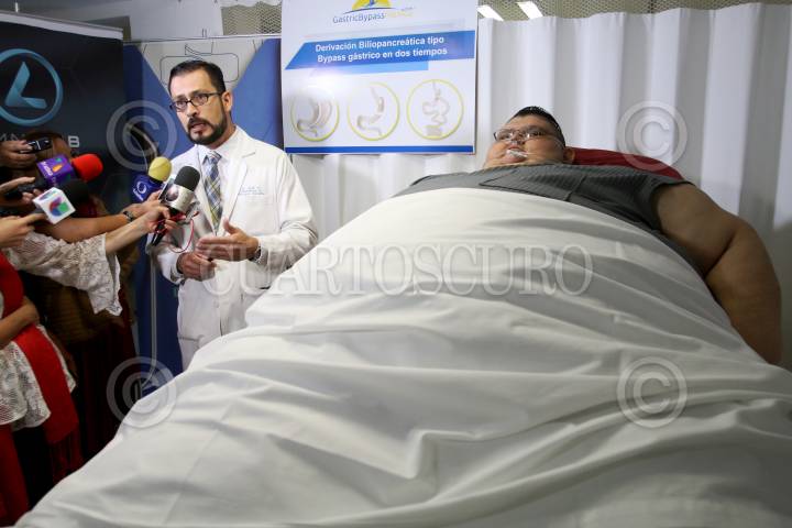 GUADALAJARA, JALISCO. 21DICIEMBRE2016.- Juan Pedro Franco de 32 años de edad, uno de los hombres mas obesos del mundo con 590 kilos de peso, estuvo en el hospital Jardines Guadalupe para una revisión de rutina, en donde también el Doctor José A. Castañeda ofreció una conferencia de prensa para dar a conocer los pormenores del estado de salud actual de Juan Pedro, el cual luego de varias semanas de rigurosa atención multidisciplinaria y de implementar un tratamiento de choque se logro estabilizar al paciente así como los avances en el procedimiento que se llevan a cabo para poder someter a cirugía reductiva a Juan Pedro. Endicha conferencia de prensa se dio a conocer un numero de cuenta a nombre de la madre del paciente, María de Jesús Salas Lemus de Santander : 60-58582329-4, dirigida a la sociedad en general que quiera apoyar a Juan Pedro Franco en su tratamiento medico. FOTO : FERNANDO CARRANZA GARCIA / CUARTOSCURO.COM
