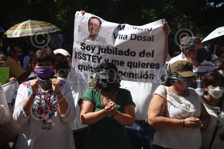 Trabajadores en activo y jubilados del Gobierno del Estado de Yucatán frente a Palacio de Gobierno para exigir castigo a los responsables del desfalco de 2 mil millones de pesos del Instituto de Seguridad Social de los Trabajadores del Estado (Isstey)