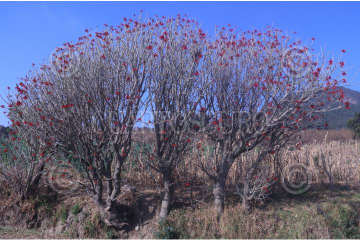 Arboles de tzompantle en temporada de florecimiento, la flor tipo vaina alargada de color rojo intenso es comestible.