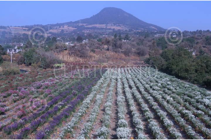 Cultivo de flores en la comunidad de Cuecuecuautitla en el municipio de Tepetlixpa, al fondo se erige el cerro Escobeta.