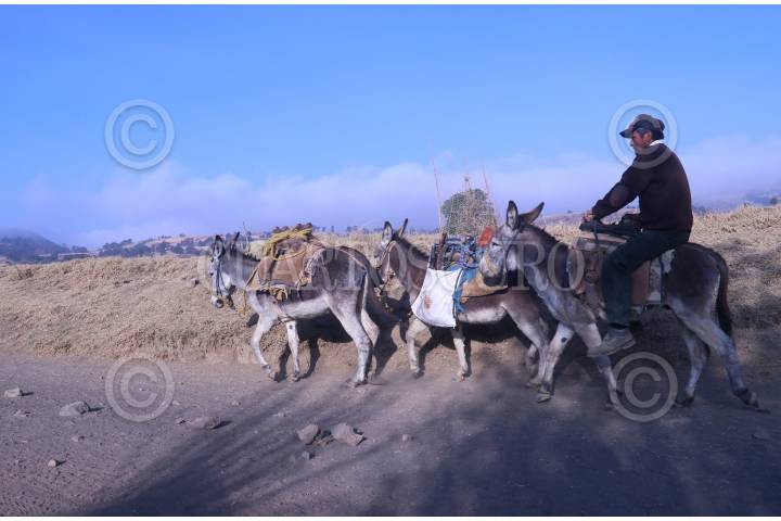 Un campesino con tres burros se dirige a su parcela de labranza en el municipio de Juchitepec.