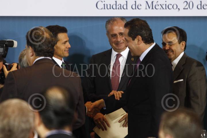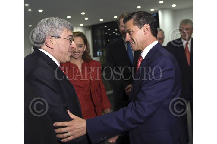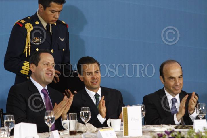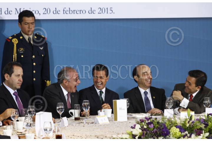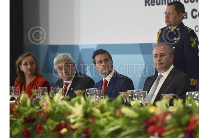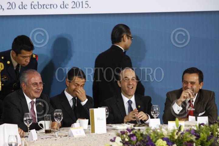 MÉXICO, D.F., 20FEBRERO2015.- El presidente Enrique Peña Nieto acompañado de Eruviel Avila, gobernador del Estado de México; Salomóm Achar, presidente del Comité Central de la Comunidad Judía de México; Leonardo Kats, presidente del Centro Deportivo Israelita e Ildefonso Guajardo, secretario de Economía durante la Comida con la Comunidad Judía de México que se realizó en el Centro Deportivo Israelita. FOTO: RODOLFO ANGULO /CUARTOSCURO.COM