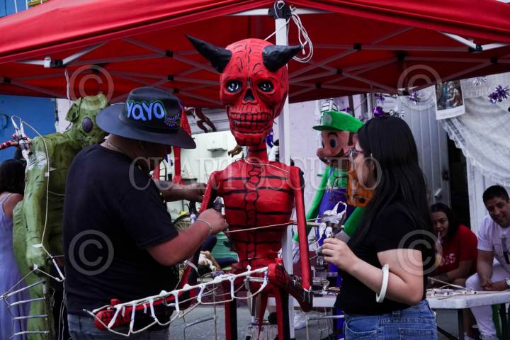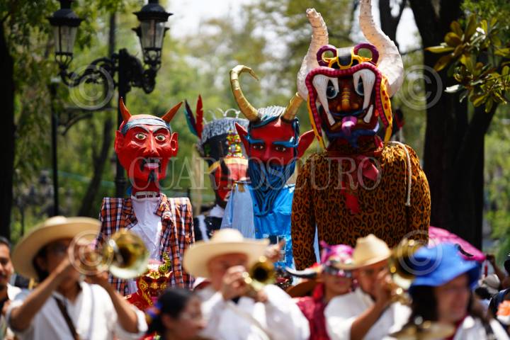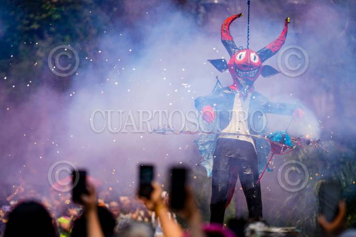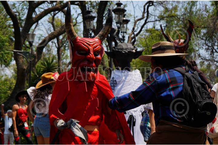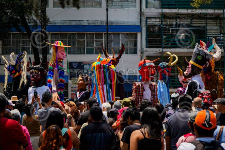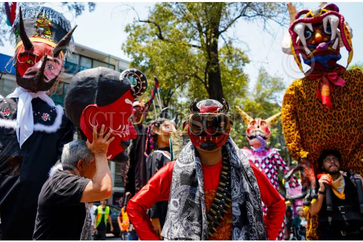 CIUDAD DE MÉXICO, 19ABRIL2025.- Mojigangas y personas disfrazadas de diablos desfilaron previo a la tradicional Quema del Judas con motivo del Sábado de Gloria que el colectivo Cartoneros de la Ciudad de México realizó durante del octavo festival de la cartonería en el Kiosco Morisco de la alcaldía Cuauhtémoc. FOTO: GALO CAÑAS/CUARTOSCURO.COM