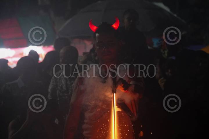 CIUDAD DE MÉXICO, 19ABRIL2025.- Un hombre disfrazado de diablo baila previo a la tradicional Quema del Judas con motivo del Sábado de Gloria que el colectivo Cartoneros de la Ciudad de México realizó durante del octavo festival de la cartonería en el Kiosco Morisco de la alcaldía Cuauhtémoc. FOTO: GALO CAÑAS/CUARTOSCURO.COM