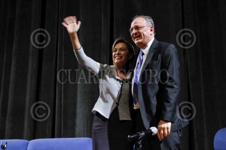 MÉXICO, D.F., 01JUNIO2012.- Josefina Vázquez Mota, candidata a la Presidencia de la República por el PAN, se reunió con miembros de la comunidad judía en el Colegio Montes Sinaí, en la delegación Cuajimalpa. En la imagen, con el periodista Ezra Shabot, quien fungió como entrevistador de la aspirante presidencial. FOTO: ISAAC ESQUIVEL /CUARTOSCURO.COM