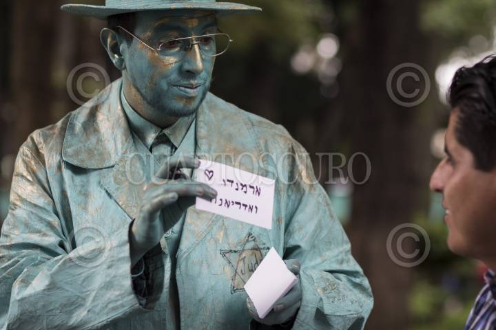 MÉXICO, D.F., 10AGOSTO2014.- Un joven se disfraza de judío en homenaje a los judíos muertos durante el Holocausto Nazi al tiempo que escribe en hebreo el nombre de los transeúntes que le regalen una moneda, en el centro de Coyoacán. FOTO: DAVID POLO /CUARTOSCURO.COM
