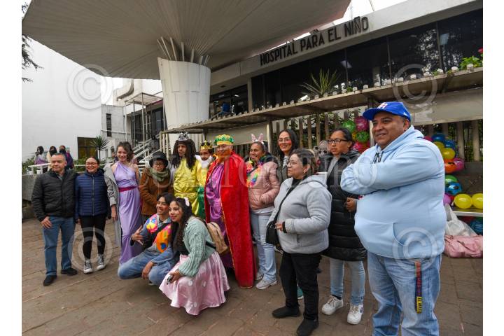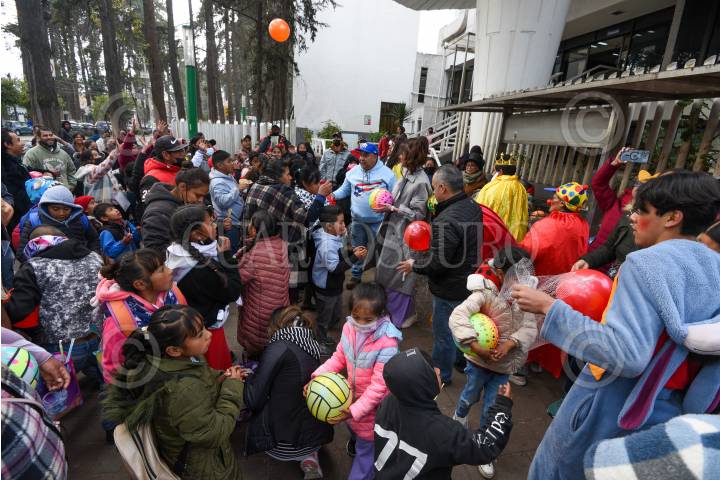 TOLUCA, ESTADO DE MÉXICO, 06ENERO2025.- Este Día de Reyes integrantes de la fundación Payasonicos al Rescate acudieron al Hospital para el Niño en Toluca a entregar dulces, pelotas y ropa a niños y adultos, llevan 16 años con esta labor, también acuden a otros hospitales, albergues para migrantes y también apoyan a personas en situación de calle; inician con una lluvia de dulces, risoterapia en donde involucran a niños y papás y hacen que pasen un rato ameno, entregan los juguetes y ropa. Llevan un pico de felicidad a las familias que se encuentran afuera del hospital que esperan informes sobre su paciente. FOTO: CRISANTA ESPINOSA AGUILAR /CUARTOSCURO.COM