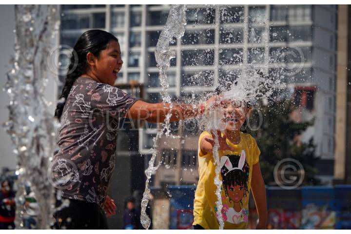 CIUDAD DE MÉXICO, 25ENERO2025.- Niñas juegan en la fuente de la explanada del Monumento a la Revolución. FOTO: MAGDALENA MONTIEL/CUARTOSCURO.COM