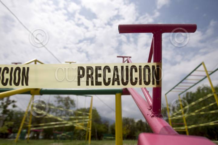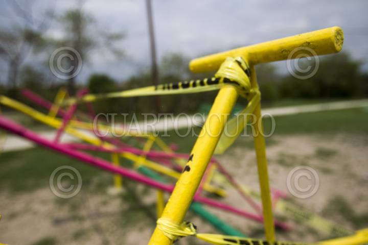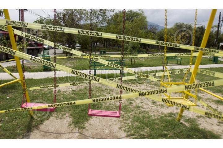 GUADALUPE, NUEVO LEÓN, 18ABRIL2020.- Juegos infantiles son asegurados para que los ciudadanos no acudan a los parques púbicos con niños en el interior de las colonias en el área metropolitana de Monterrey durante la contingencia por el coronavirus. Hasta el 18 de abril se reportan 7 defunciones en el estado de Nuevo León. FOTO: GABRIELA PÉREZ MONTIEL / CUARTOSCURO.COM