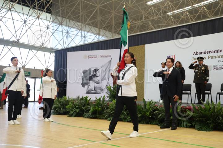 CIUDAD DE MÉXICO, 03AGOSTO2025.- Romel Pacheco, director de la Conade; Mario Delgado, secretario de Educación Pública; Mari José Alcalá, directora del Comité Olímpico Mexicano y los deportistas Melani Naomi Jiménez Villalba, lucha; Ángela Ruiz, tiro con arco, y Eitan Nuno, ciclismo, estos dos últimos abanderados de la delegación que participará en los Juegos Panamericanos Junior de Asunción, encabezaron la ceremonia previa su partida rumbo a Paraguay en instalaciones del Centro Nacional de Alto Rendimiento. FOTO: MOISÉS PABLO/CUARTOSCURO.COM