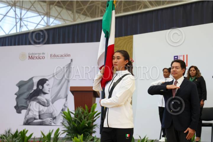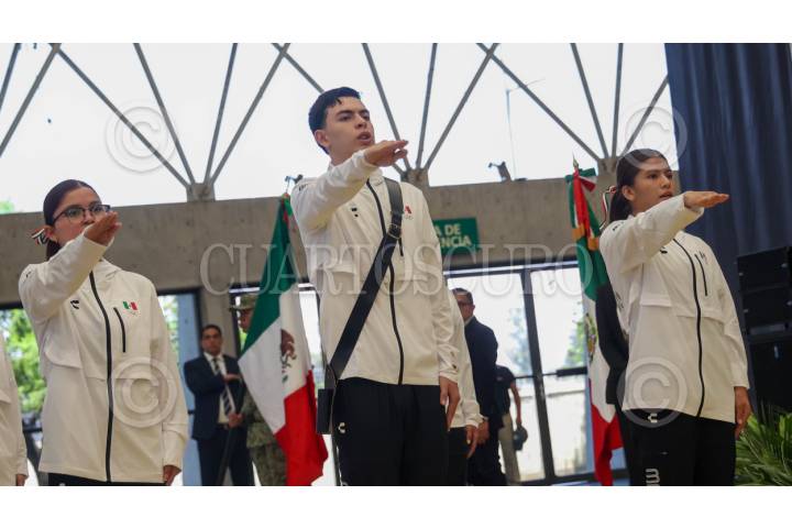 CIUDAD DE MÉXICO, 03AGOSTO2025.- Romel Pacheco, director de la Conade; Mario Delgado, secretario de Educación Pública; Mari José Alcalá, directora del Comité Olímpico Mexicano y los deportistas Melani Naomi Jiménez Villalba, lucha; Angela Ruiz, tiro con arco, y Eitan Nuno, ciclismo, estos dos últimos abanderados de la delegación que participará en los Juegos Panamericanos Junior de Asunción, encabezaron la ceremonia previa su partida rumbo a Paraguay en instalaciones del Centro Nacional de Alto Rendimiento. FOTO: MOISÉS PABLO/CUARTOSCURO.COM