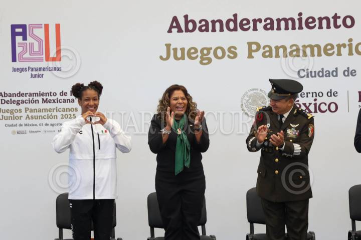 CIUDAD DE MÉXICO, 03AGOSTO2025.- La tiradora Ángela Ruiz Rosales fue una de las dos abanderadas de la delegación que participará en los Juegos Panamericanos Junior Asunción 2025, que se realizó en el Centro Nacional de Alto Rendimiento. El lábaro patrio le fue entregado por Mario Delgado, titular de la SEP. FOTO: MOISÉS PABLO/CUARTOSCURO.COM