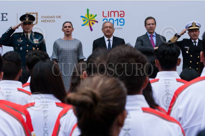 CIUDAD DE MÉXICO, 15JULIO2019.- Luis Cresencio Sandoval, secretario de la Defensa Nacional, Ana Gabriela Guevara, titular de la Comisión Nacional de Cultura Física y Deporte (CONADE), Andrés Manuel López Obrador, presidente de México, Esteban Moctezuma Barragán, secretario de Educación Pública, y Rafael Ojeda, secretario de Marina, durante el abanderamiento de la Delegación Mexicana para los 18º Juegos Panamericanos de Lima, Perú 2019. FOTO: GALO CAÑAS /CUARTOSCURO.COM