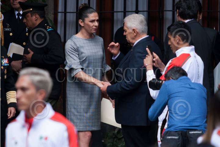 CIUDAD DE MÉXICO, 15JULIO2019.- Ana Gabriela Guevara, titular de la Comisión Nacional de Cultura Física y Deporte (CONADE), y Carlos Padilla Becerra, presidente del Comité Olímpico Mexicano, durante el abanderamiento de la Delegación Mexicana para los 18º Juegos Panamericanos de Lima, Perú 2019. FOTO: GALO CAÑAS /CUARTOSCURO.COM