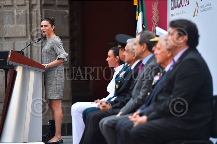 CIUDAD DE MÉXICO, 15JULIO2019.- Ana Gabriela Guevara, directora de la CONADE, durante el abanderamiento de la delegación de deportistas de nuestro país que participarán en los 18 Juegos Panamericanos de Lima, Perú 2019, en el patio central de Palacio Nacional. FOTO: PRESIDENCIA /CUARTOSCURO.COM