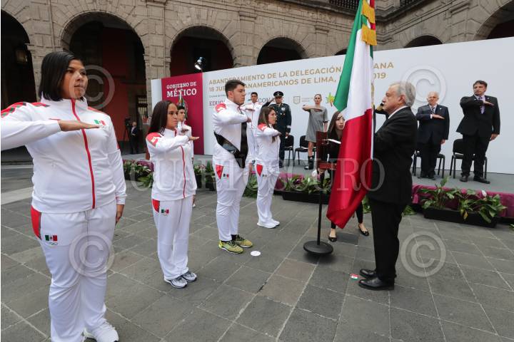 CIUDAD DE MÉXICO, 15JULIO2019.- Andrés Manuel López Obrador, Presidente de México, encabezó el abanderamiento de la delegación de deportistas de nuestro país que participarán en los 18 Juegos Panamericanos de Lima, Perú 2019, en el patio central de Palacio Nacional. Lo acompañan Ana Gabriela Guevara, directora general de la Comisión Nacional de Cultura Física y Deporte; Esteban Moctezuma Barragán, Secretario de Educación Pública; General Luis Cresencio Sandoval, Secretario de la Defensa Nacional, y el Almirante José Rafael Ojeda Durán, Secretario de Marina FOTO: PRESIDENCIA /CUARTOSCURO.COM