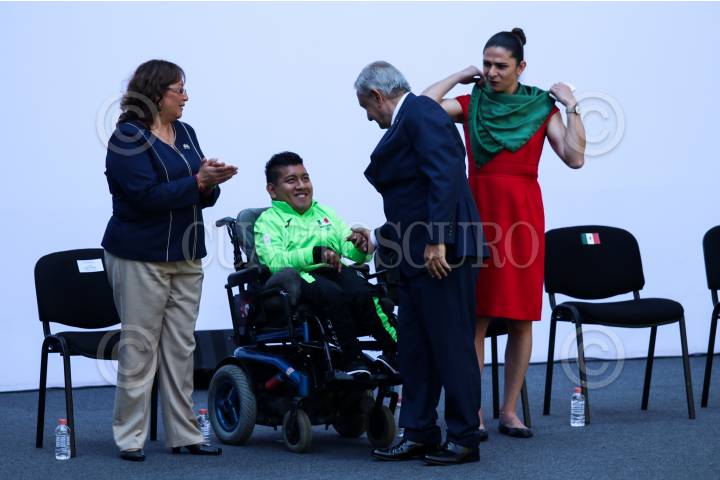 CIUDAD DE MÉXICO, 13AGOSTO2019.- Ana Gabriela Guevara, titular de la Comisión Nacional de Cultura Física y Deporte (CONADE); Lelia Ruvalcaba, atleta paralimpica de judo; el presidente Andrés Manuel López Obrador, y Esteban Moctezuma Barragán, secretario de Educación Pública, durante el abanderamiento de la federación mexicana que participara en los Juegos Parapanamericanos de Lima, Perú 2019. FOTO: GALO CAÑAS /CUARTOSCURO.COM