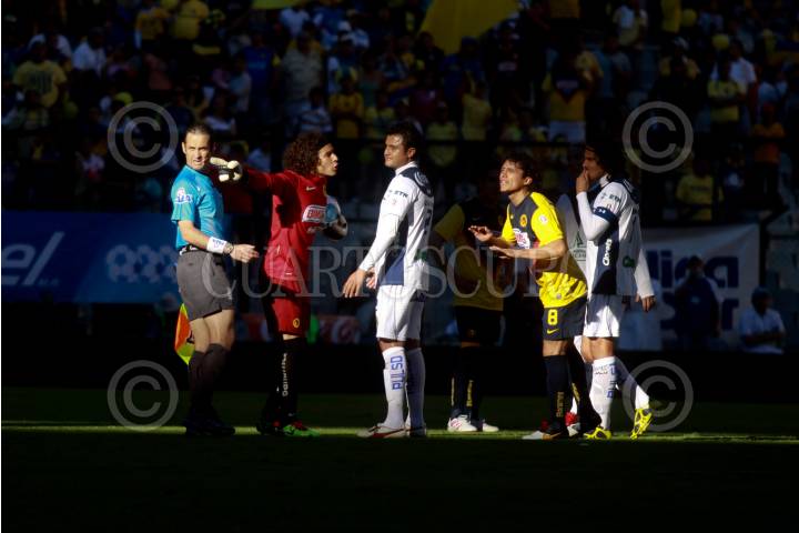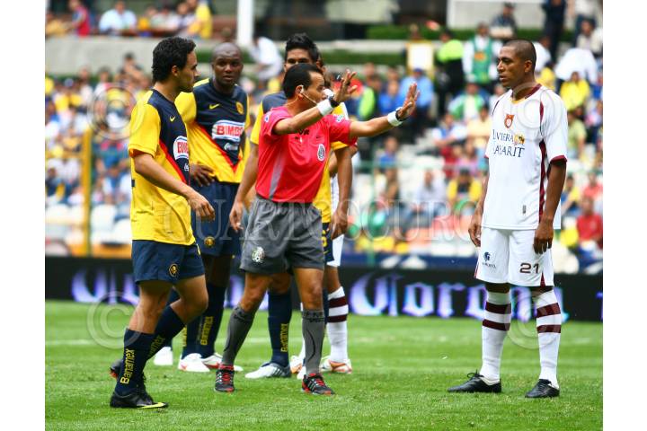 MÉXICO, D.F. 13SEPTIEMBRE2009.- El arbitro Central Fabricio Morales amonesta a los jugadores durante el encuentro de esta tarde con las Aguilas del America y Estudiantes, quedando un marcador final de 5-0 a favor de las Aguilas, encuentro jugado en la cancha del Estadio Azteca, en el cierre de la jornada 8 del Apertura. FOTO: SÁSHENKA GUTIÉRREZ/CUARTOSCURO.COM