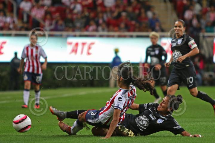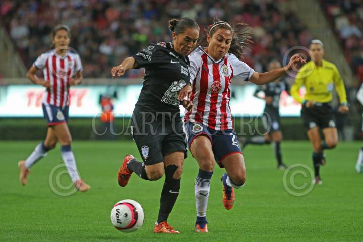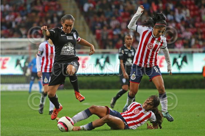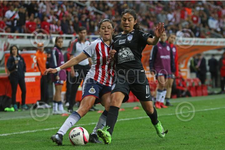 ZAPOPAN, JALISCO. 24NOVIEMBRE2017.- Mónica Ocampo jugadora de Pachuca disputa un balón a Miriam García de Chivas, en partido correspondiente a la Final del Torneo Apertura 2017 de la Liga MX Femenil, en donde se enfrentan los equipos de las Chivas vs Pachuca, en juego que se lleva a cabo en el Estadio Chivas. El marcador al momento es de 1-0 a favor del equipo local. FOTO: FERNANDO CARRANZA GARCIA / CUARTOSCURO.COM