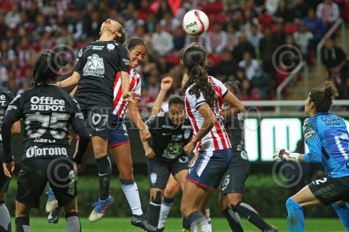 ZAPOPAN, JALISCO. 24NOVIEMBRE2017.- Jugadoras de Chivas y Pachuca disputan el balón en el área visitante, en partido correspondiente a la Final del del Torneo Apertura 2017 de la Liga MX Femenil, en donde se enfrentan los equipos de las Chivas vs Pachuca, en juego que se lleva a cabo en el Estadio Chivas. El marcador al momento es de 3-0 a favor del equipo local. FOTO: FERNANDO CARRANZA GARCIA / CUARTOSCURO.COM