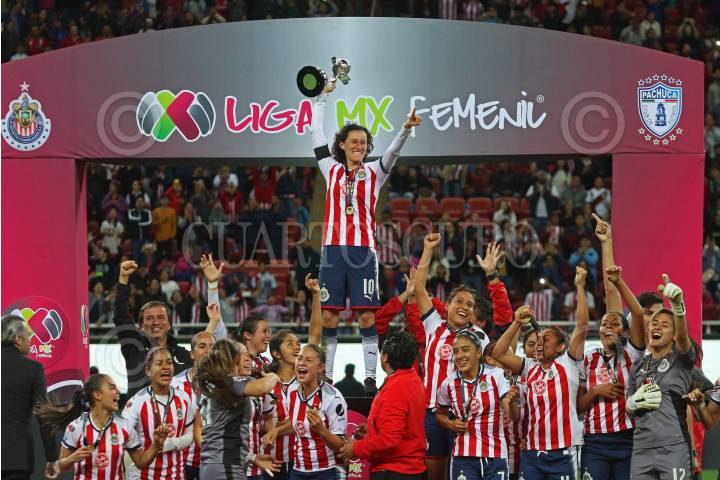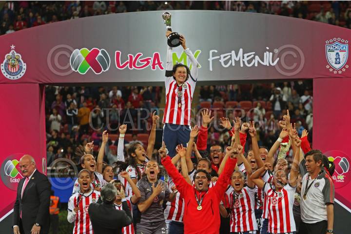 ZAPOPAN, JALISCO. 24NOVIEMBRE2017.- Jugadoras así como cuerpo técnico de Chivas celebran la victoria y levantan su primera copa en el torneo al vencer a su rival, en partido correspondiente a la Final del del Torneo Apertura 2017 de la Liga MX Femenil, en donde se enfrentaron los equipos de las Chivas vs Pachuca, en juego que se llevo a cabo en el Estadio Chivas. El marcador al final fue de 3-0 a favor del equipo local. FOTO: FERNANDO CARRANZA GARCIA / CUARTOSCURO.COM