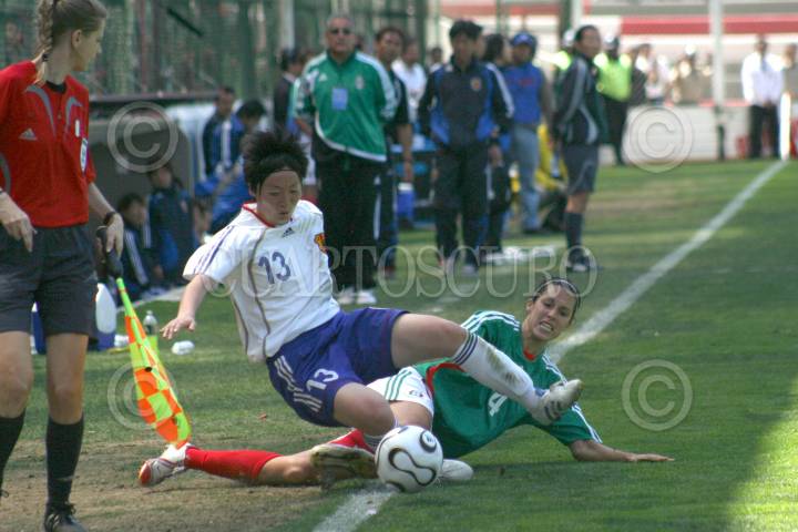 TOLUCA, ESTADO DE MÉXICO, 17MARZO2007.- La mexicana Mónica González gana el balón a la japonesa K. Yano, durante el partido que la Selección Femenil Mexicana de Futbol ganó a su similar de Japón por marcador de 2-1, pero no consiguió su pase al Mundial de China, al terminar 3-2 el marcador global. FOTO: ISAAC ESQUIVEL/CUARTOSCURO.COM