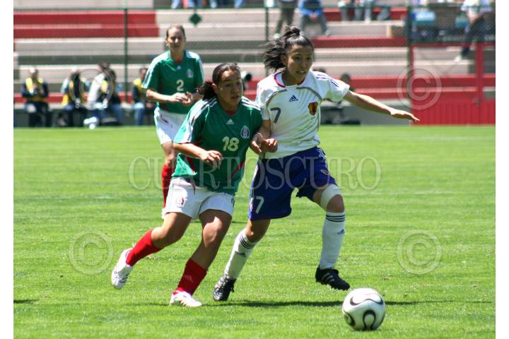TOLUCA, ESTADO DE MÉXICO, 17MARZO2007.- La mexicana Fatima Leyva pelea el balón, durante el partido que la Selección Femenil Mexicana de Futbol ganó a su similar de Japón por marcador de 2-1, pero no consiguió su pase al Mundial de China, al terminar 3-2 el marcador global. FOTO: ISAAC ESQUIVEL/CUARTOSCURO.COM