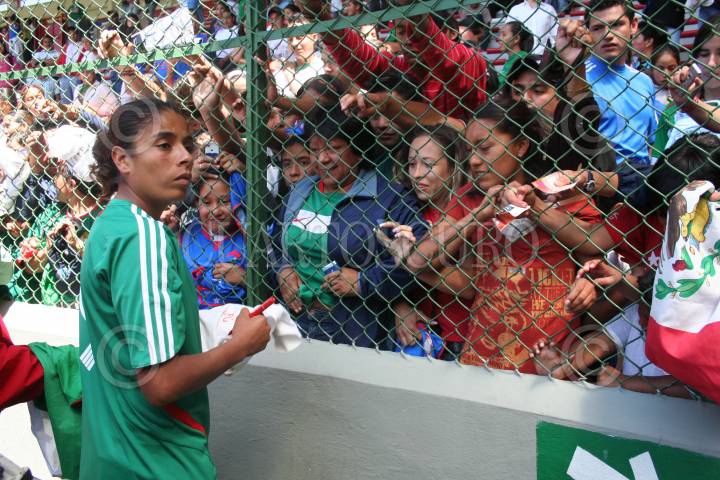 TOLUCA, ESTADO DE MÉXICO, 17MARZO2007.- La mexicana Maribel Domínguez convivió con aficionados al término del encuentro que la Selección Femenil Mexicana de Futbol ganó a su similar de Japón por marcador de 2-1, pero no consiguió su pase al Mundial de China, al terminar 3-2 el marcador global. FOTO: ISAAC ESQUIVEL/CUARTOSCURO.COM