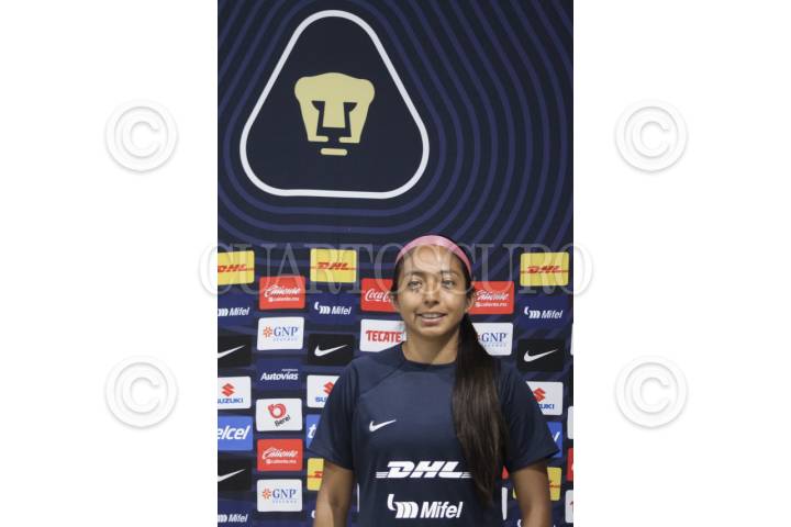 La jugadora Citlali Hernández en conferencia de prensa del equipo Pumas Femenil, con miras al inicio del torneo Clausura 2023 de la liga MX Femenil, en instalaciones de la Cantera.