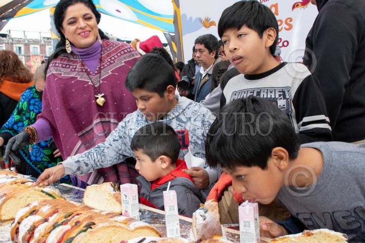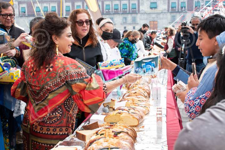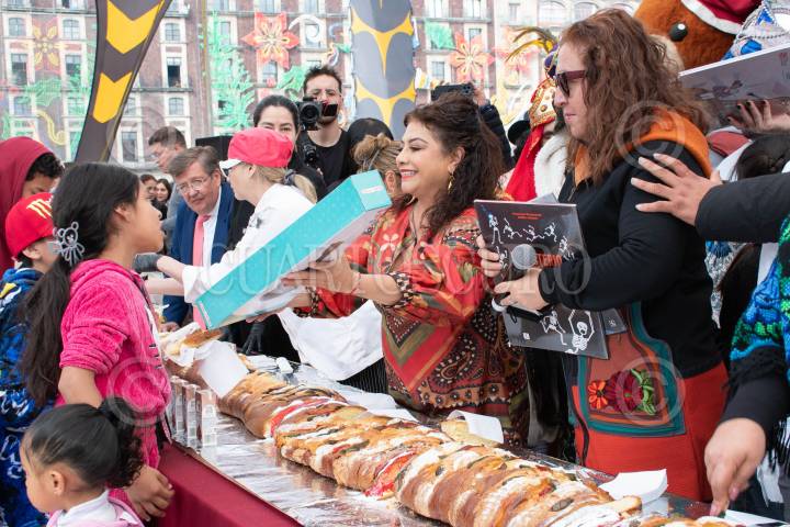 CIUDAD DE MÉXICO, 05ENERO2025.- La jefa de Gobierno, Clara Brugada, encabezó los festejos del Día de Reyes en el corazón de la Ciudad de México, donde miles de familias se dieron cita en el Zócalo para disfrutar de una celebración llena de color, alegría y tradición. El momento más esperado fue la partida de la majestuosa Mega Rosca de 400 metros lineales, que se extendía imponente como símbolo de unión y convivencia entre los capitalinos. La celebración incluyó la entrega de más de 15 mil juguetes lúdicos, cuidadosamente seleccionados para no promover la violencia, incentivando en su lugar la imaginación y la creatividad de los más pequeños. FOTO: GOBIERNO DE LA CIUDAD DE MÉXICO/CUARTOSCURO.COM