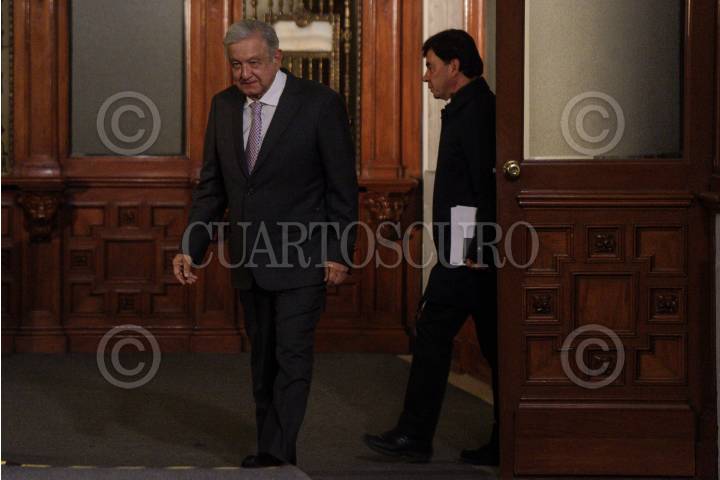 Andrés Manuel López Obrador, presidente de México, durante su llegada a conferencia de prensa matutina en Palacio Nacional, en la que habló sobre la resolución del juicio de Genaro García Luna, ex secretario de Seguridad Pública.