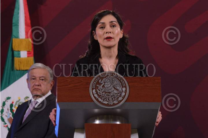 Elizabeth García Vilchis, directora de Redes de la Coordinación General de Comunicación Social y Vocería de Presidencia, y Andrés Manuel López Obrador, presidente de México, durante conferencia de prensa matutina en Palacio Nacional.