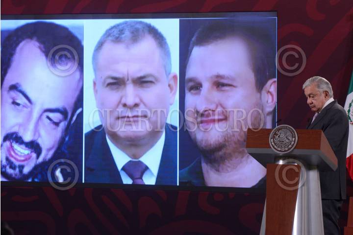 Andrés Manuel López Obrador, presidente de México, encabezó conferencia de prensa matutina en Palacio Nacional. En la proyección se muestra a Genaro García Luna, ex secretario de Seguridad Pública junto a los narcotráficantes: Arturo Beltrán Leyva y Édgar Valdez Villarreal "La Barbie".