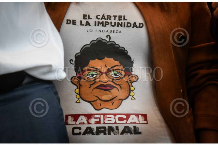CIUDAD DE MÉXICO, 01DICIEMBRE2023.- Daniela Álvarez, diputada del PAM en el congreso local, porta una playera con una caricatura de Ernestina Godoy, Fiscal General de Justicia de la capital, durante la conferencia de Santiago Taboada, precandidato a la jefatura de la Ciudad de México por el Frente Amplio por México, en la que presentó juicio por vulneración a sus derechos electorales en contra de legisladores de Morena a quienes acusó de buscar impedir su candidatura luego de suspender la sesión del congreso local en la que se tenía contemplada aprobar la licencia definitiva como a su cargo como Alcalde de Benito Juárez. FOTO: MARIO JASSO/CUARTOSCURO.COM