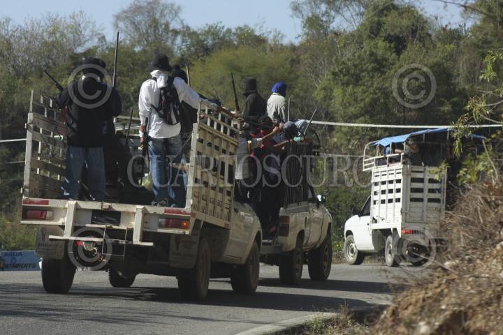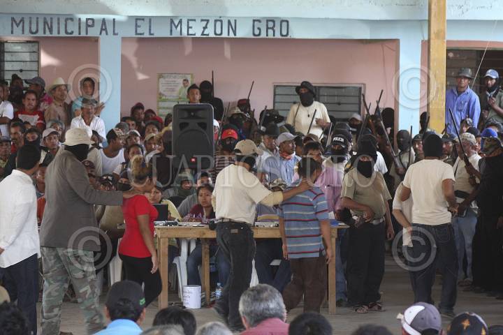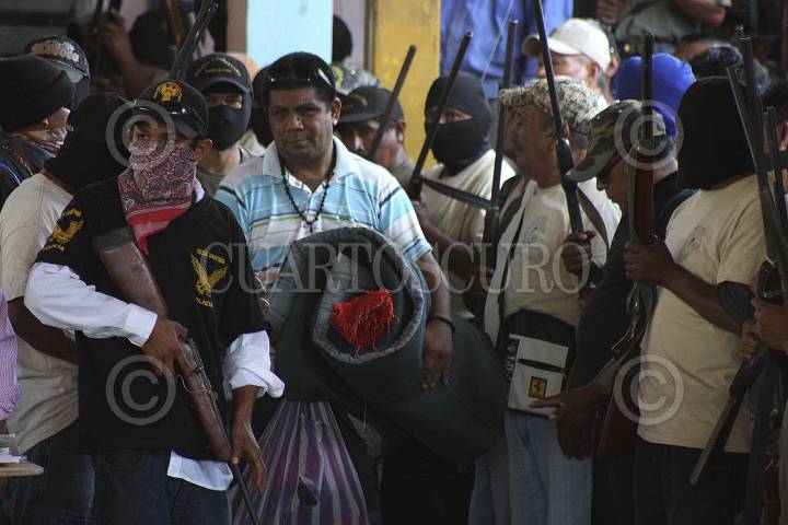 AYUTLA, GUERRERO, 31ENERO2013.- La Unión de los Pueblos y Organizaciones del Estado de Guerrero inicio el juicio en contra de las 54 personas detenidas por la policía comunitaria de Ayutla. Por la mañana hubo una movilización por parte de varios grupos de hombre armados que integran los comités de vigilancia en otras localidades. Entre las personas que van ser enjuiciadas se encuentras la mamá, el papá, dos hermanos y la pareja sentimental del supuesto líder del municipio de Ayutla, identificado como "El Cholo". Entre los detenidos están tres mujeres y cuatro menores edad, el juicio se realiza en la explanada del municipio. FOTO: ALMA LAFAYET /CUARTOSCURO.COM