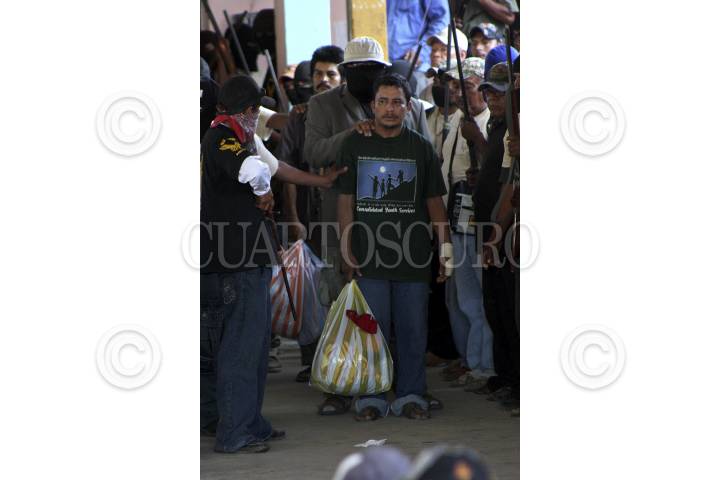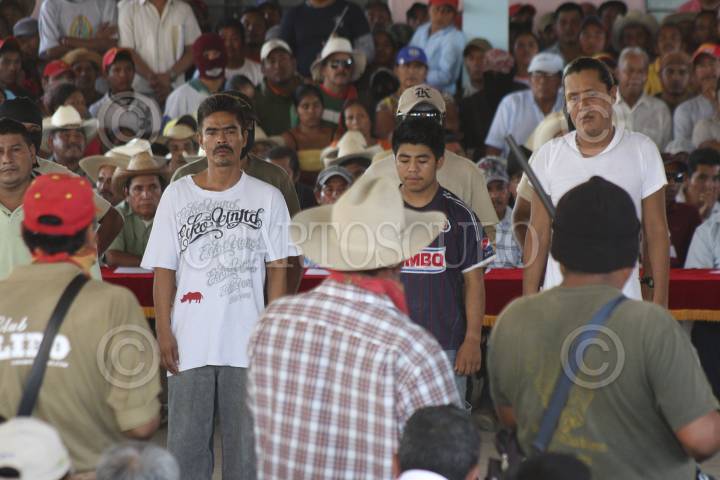 AYUTLA, GUERRERO, 31ENERO2013.- La Unión de los Pueblos y Organizaciones del Estado de Guerrero inicio el juicio en contra de las 54 personas detenidas por la policía comunitaria de Ayutla. Por la mañana hubo una movilización por parte de varios grupos de hombre armados que integran los comités de vigilancia en otras localidades. Entre las personas que van ser enjuiciadas se encuentras la mamá, el papá, dos hermanos y la pareja sentimental del supuesto líder de plaza del municipio de Ayutla, identificado como "El Cholo". Entre los detenidos están tres mujeres y cuatro menores edad, el juicio se realiza en la explanada del municipio. FOTO: ALMA LAFAYET /CUARTOSCURO.COM
