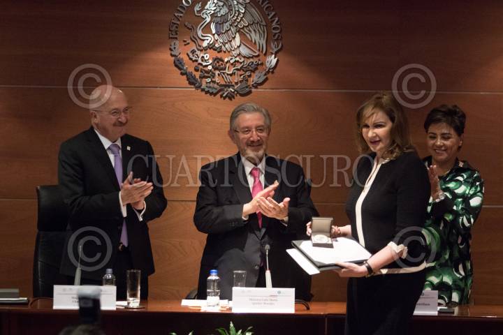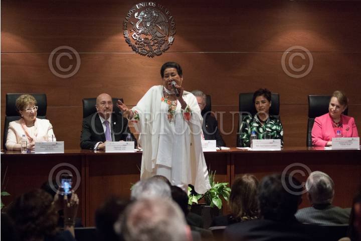 CIUDAD DE MÉXICO, 06MARZO2017.- Luis María Aguilar, presidente de la Suprema Corte de Justicia de la Nación acompañados de magistrados del Poder Judicial de la Federación, entregaron reconocimientos a la magistrada Nora Elizabeth Urby y al magistrado , Mario de la Huerta Portillo, e inauguraron la exposición "Diosas Mujeres Profanas" del artista Federico Kampf, como parte del festejo de día internacional de la mujer. En la imagen la actriz oaxaqueña Aurora Clavel ofreció un recital al final de la ceremonia. FOTO: SAÚL LÓPEZ /CUARTOSCURO.COM