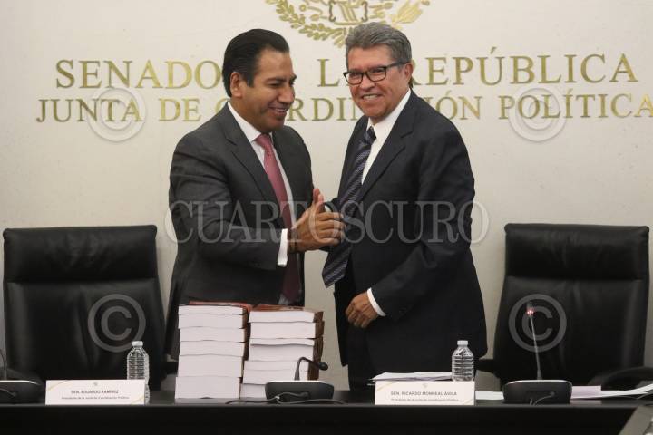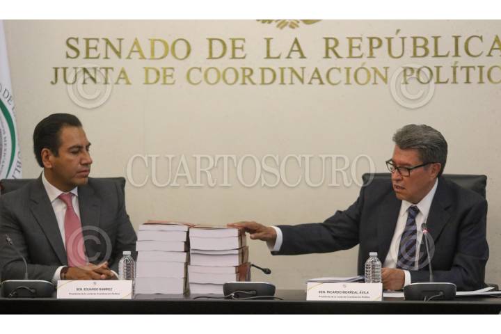 El Senador Chiapaneco Eduardo Ramírez recibe el informe de manos de Ricardo Monreal Ávila, quien deja su cargo para contender por la candidatura a la Presidencia por Morena.