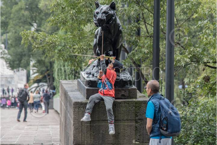 CIUDAD DE MÉXICO, 03SEPTIEMBRE2017.- Un niño juega con su arco de juguete cerca de una estatua situada en el Pasaje de la Juventud Heroica del Bosque de Chapultepec. FOTO: MARIO JASSO /CUARTOSCURO.COM
