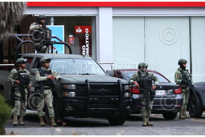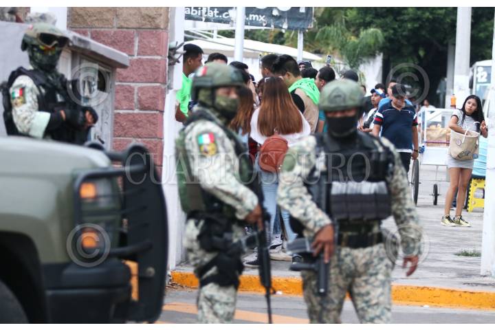 CUERNAVACA, MORELOS, 22MAYO2024.- Margarita González Saravia, candidata a la gubernatura del estado por la coalición "Sigamos Haciendo Historia en Morelos" (MORENA, PVEM, PT) participo en el Festival de las Juventudes, evento que se realizó para festejar a los estudiantes. En la imagen, efectivos del ejército mexicano realizan vigilancia fuera del recinto donde se realiza el mitin político. FOTO: MARGARITO PÉREZ RETANA/CUARTOSCURO.COM