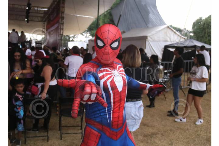 CUERNAVACA, MORELOS, 22MAYO2024.- Margarita González Saravia, candidata a la gubernatura del estado por la coalición "Sigamos Haciendo Historia en Morelos" (MORENA, PVEM, PT) participo en el Festival de las Juventudes, evento que se realizó para festejar a los estudiantes. En la imagen, un asistente al mitin disfrazada de super héroe. FOTO: MARGARITO PÉREZ RETANA/CUARTOSCURO.COM