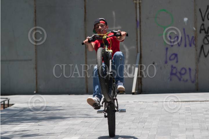 Un joven monta su bicicleta en una rueda en la Alameda Central.