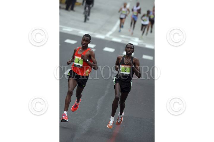 MÉXICO, D.F., 12SEPTIEMBRE2010.- Los kenianos Julius Ketter y Hilary Kimaiyo, 2do y 1er lugar respectivamente, compiten durante la edición XXVIII del Maratón Internacional de la Ciudad de México a lo largo de 42 kilómetros de las principales vialidades de la capital, comenzado en el Zócalo capitalino y recorriendo vialidades como Reforma, Revolución e Insurgentes Sur. Con 2 horas, 12 minutos y 10 segundos, el keniano Hilary Kimaiyo se adjudicó este domingo la victoria. FOTO: RODOLFO ANGULO/CUARTOSCURO.COM