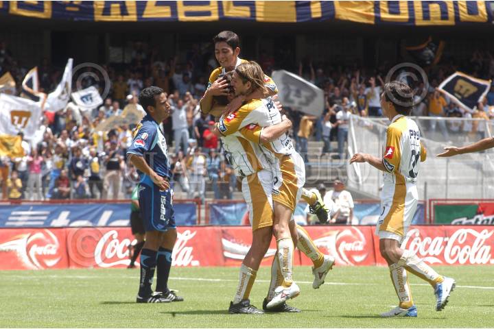 MEXDF11ABRIL2004.- Francisco "Kikín" Fonseca,es felicitado por sus compañeros al anotar el tercer gol. Los Pumas se impusierón tres goles a cero a los Camoteros del Puebla, en la cancha del estadio México 68. FOTO: Germán Romero/CUARTOSCURO.COM