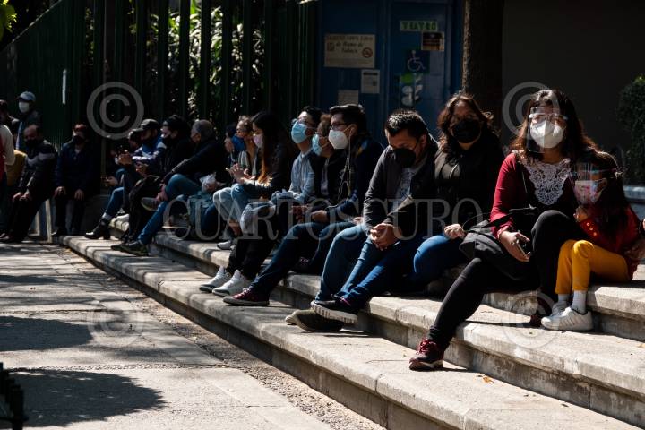 Personas jóvenes esperan su turno kiosco Covid-19 en la alcaldía Cuauhtémoc tras el aumento de contagios en población infanti y de 18 a 39 años.