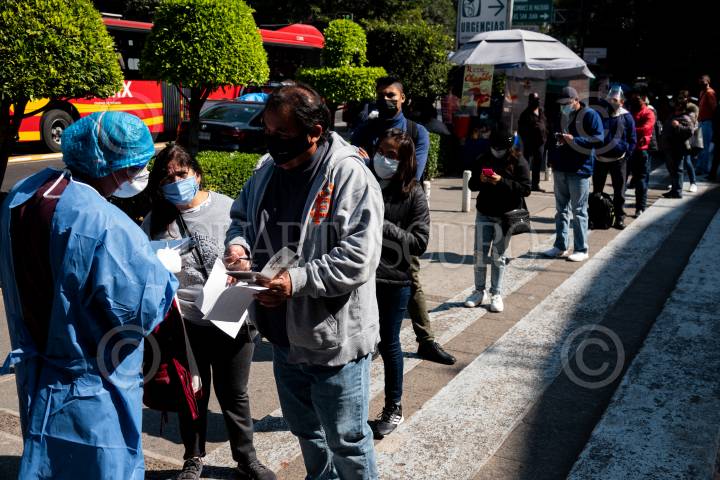 Larga fila en el quiosco de pruebas covid-19 en Miguel Hidalgo.