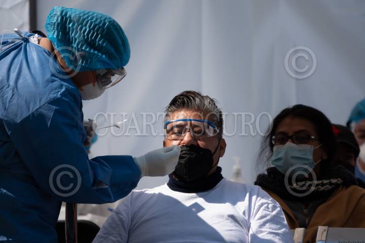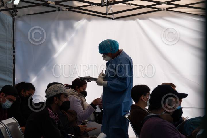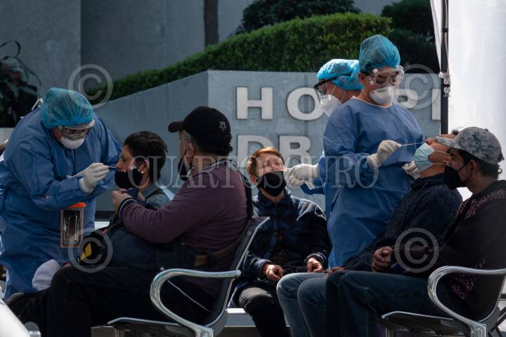 Aplicación de pruebas en el kiosco Covid-19 en la alcaldía Cuauhtémoc tras el aumento de contagios en población infanti y de 18 a 39 años.