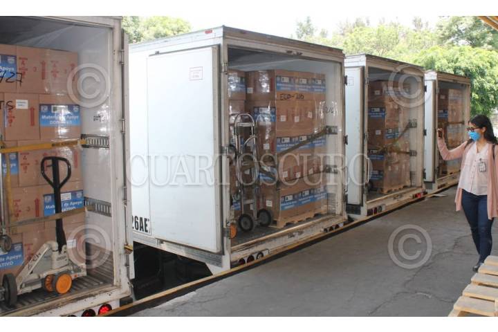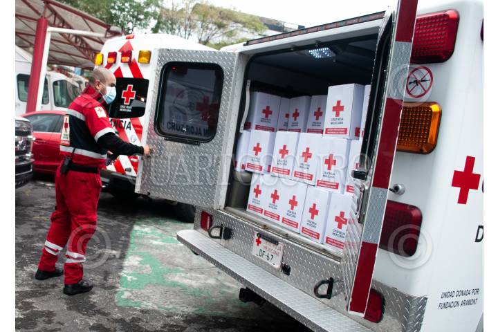 Kits de la Cruz Roja abordo de las ambulancias listos para ser repartidos.