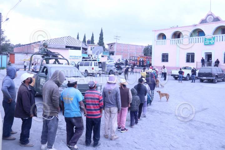 Habitantes de San Pedro Benito Juárez, en Atlixco, hacen fila para recibir un kit de protección por la contingencia volcanica que entrega el gobierno de Puebla.