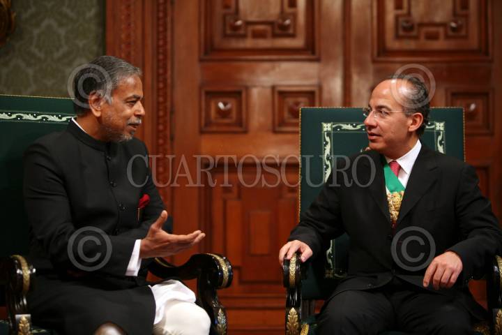 MÉXICO, D.F., 26FEBRERO2009.- El presidente de México, Felipe Calderón Hinojosa, durante la presentación de cartas credenciales al señor, Dinesh Kumar Jain, embajador extraordinario y plenipotenciario de la República de la India. Estó tuvo lugar en el salon embajadores del Palacio Nacional. FOTO: ARIEL GUTIERREZ/CUARTOSCURO.COM